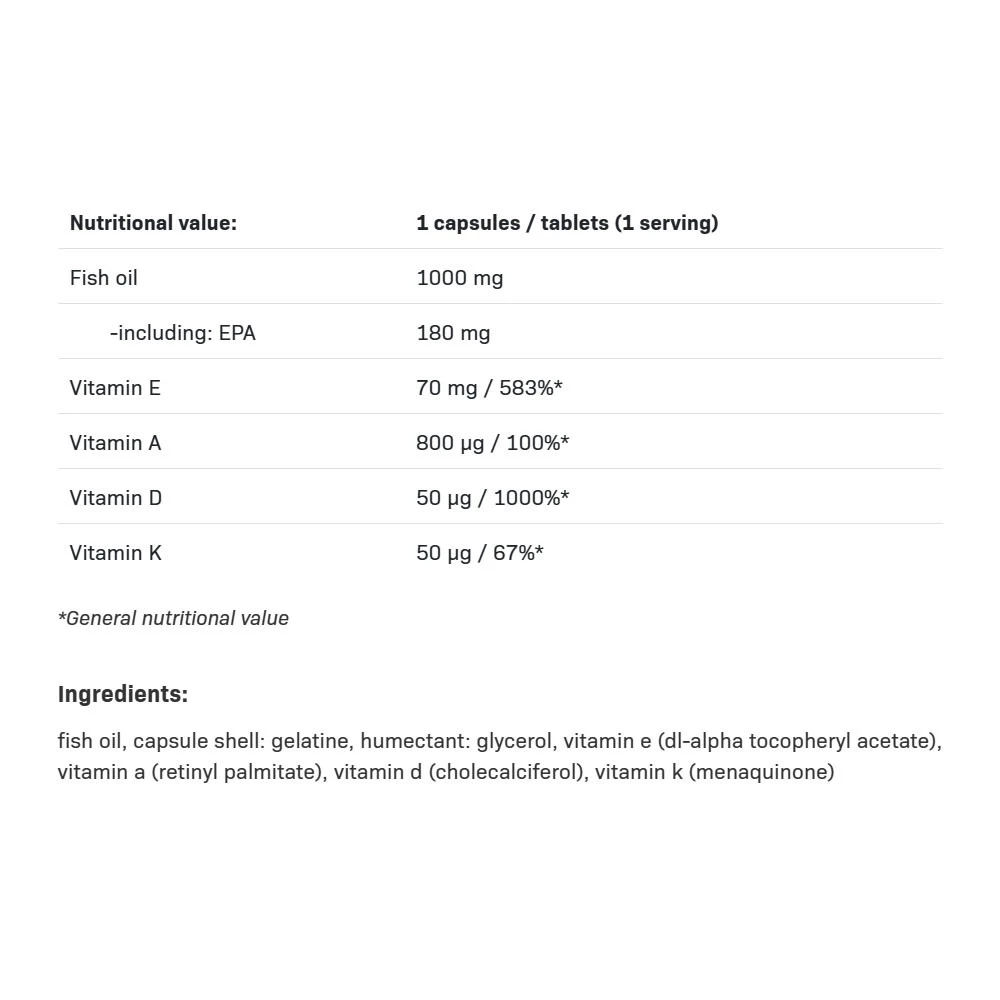 Ingredients: Fish oil (of which EPA, of which DHA), Vitamin E, Vitamin A, Vitamin D, Vitamin K, Fish oil, capsule shell: gelatine, humectant: glycerol, vitamin E (DL-alpha-tocopheryl-acetate), vitamin A (retinyl palmitate), vitamin D (cholecalciferol), vitamin K (menaquinone).
