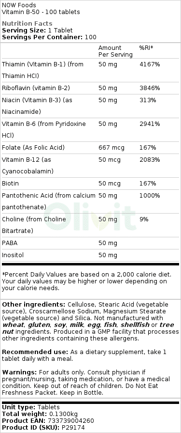 Opdag NOW Foods Vitamin B50 Tablets, et enkelt supplement til daglig brug. Disse tabletter er sammensat af en blanding af B-vitaminer samt cholin og inositol, ideelle for dig, der værdsætter produkter med naturlige ingredienser.