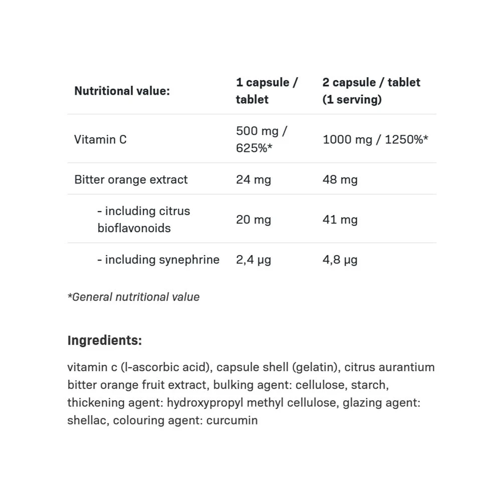 Ingredients: Vitamin C (L-ascorbic acid), capsule shell (gelatine), Citrus aurantium (bitter orange) fruit extract, bulking agent: cellulose, starch; thickener: hydroxypropylmethylcellulose; glazing agent: shellac; color: curcumin.