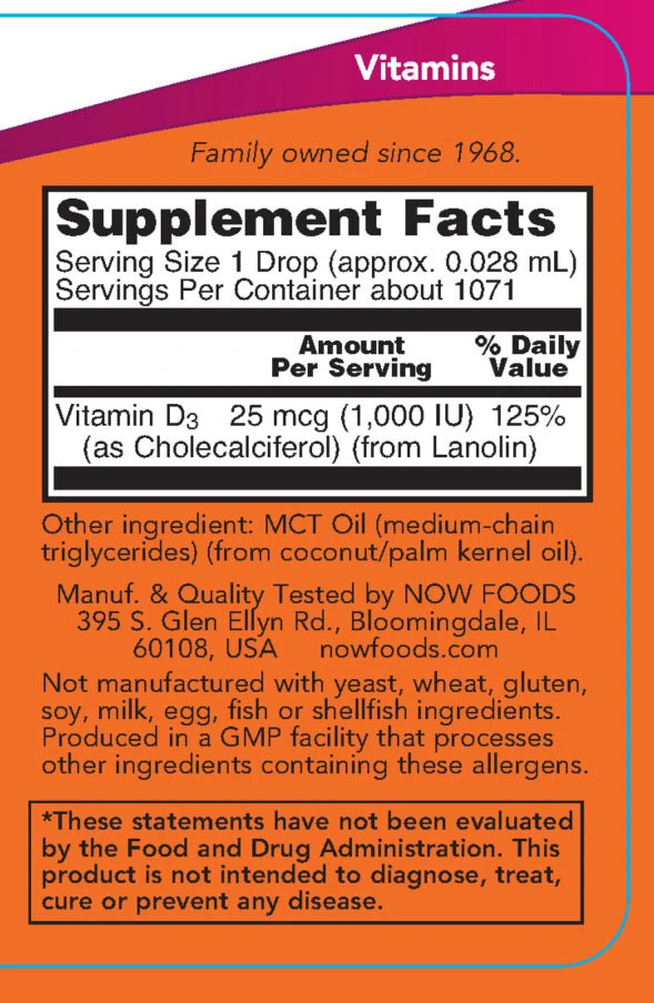 Ingredients: Vitamin D3 (as cholecalciferol) (from lanolin),MCT Oil (medium chain triglycerides from coconut/palm kernel oil).