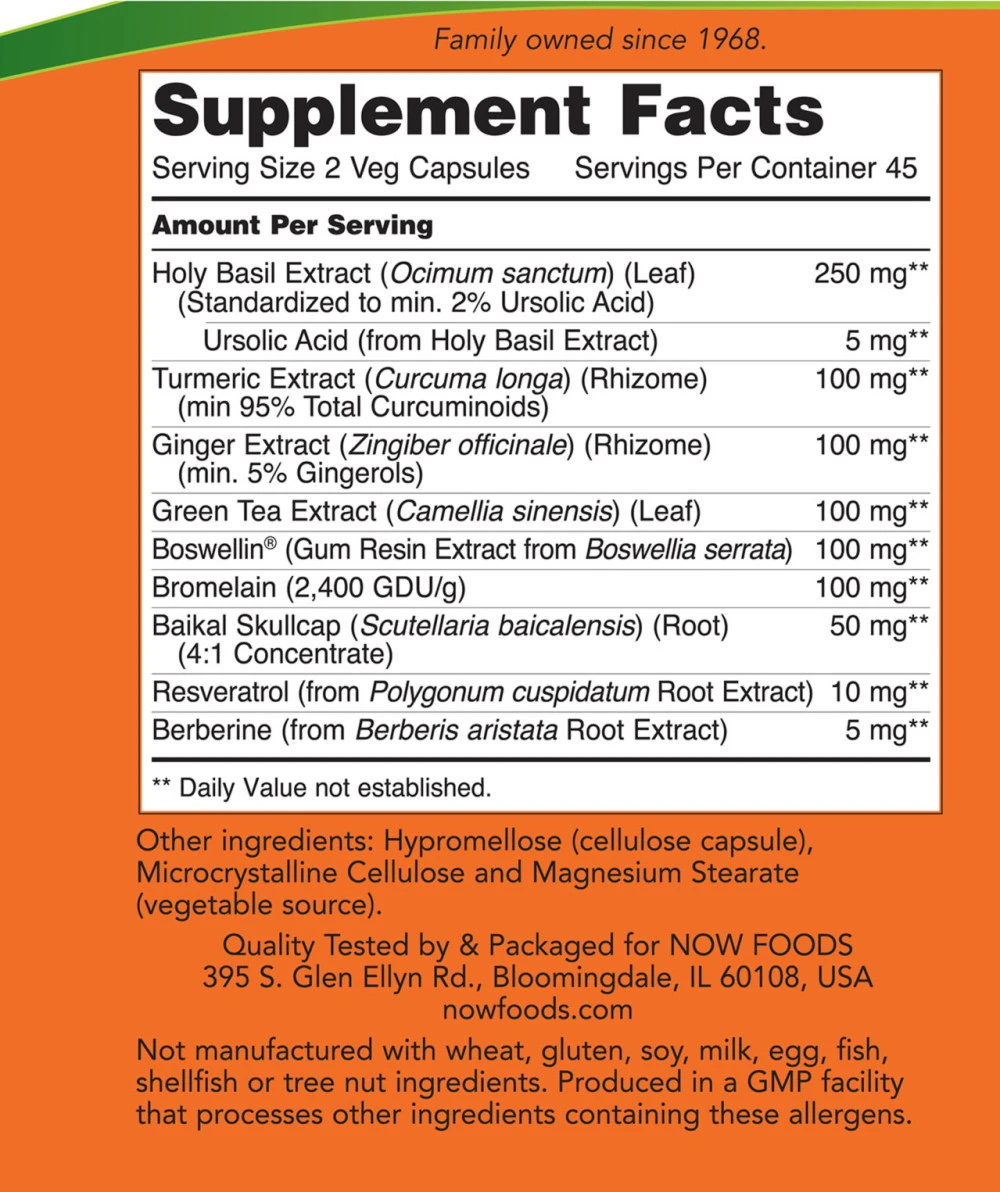 This product includes a selection of botanical ingredients such as holy basil extract (Ocimum sanctum), turmeric extract (Curcuma longa), ginger extract (Zingiber officinale), green tea extract (Camellia sinensis), Boswellin from Boswellia serrata, baikal skullcap (Scutellaria baicalensis), resveratrol from Polygonum cuspidatum root, and berberine from Berberis aristata root. Bromelain is also included in the formula. Manufactured in the United States by NOW Foods.