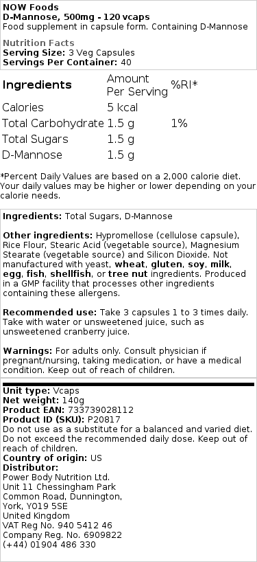 Dette produkt indeholder ren D-Mannose, et naturligt forekommende sukker. Pulveret er fri for tilsætningsstoffer og konserveringsmidler, hvilket gør det til et naturligt valg for dig.