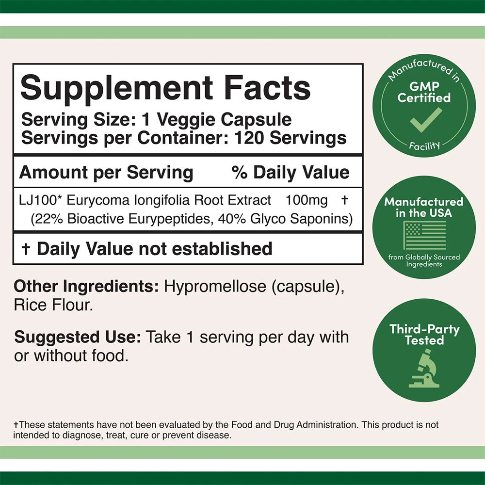 Discover Double Wood Supplements LJ 100 Tongkat ali,available in a convenient pack of 120 capsules. This food supplement is produced by Double Wood Supplements and is designed for easy daily use.