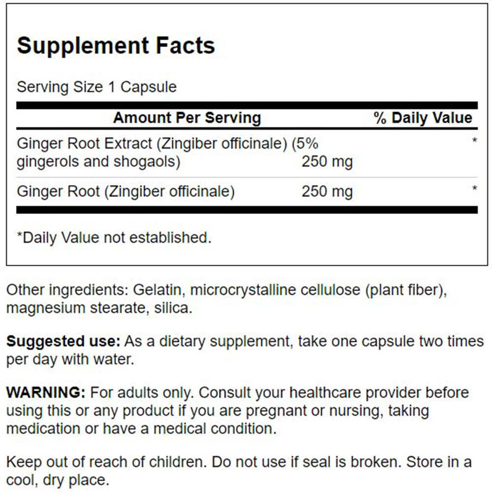 Ingredients: Ginger Root Extract (Zingiber officinale) (5% gingerols and shogaols), Ginger Root (Zingiber officinale), Gelatin, microcrystalline cellulose (plant fiber), magnesium stearate, silica.