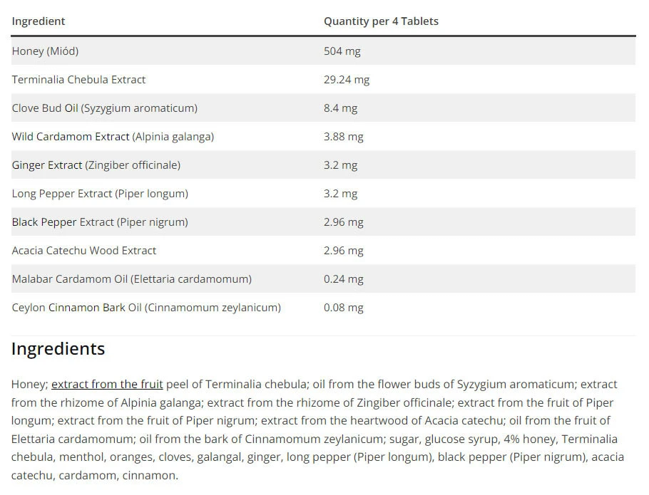 Ingredients: Sucrose, glucose syrup, honey, honey flavouring, lemon flavouring, extract from the peel of Terminalia chebula (chebulic myrobalan), menthol, oil from flower buds of Syzygium aromaticum (clove), extract from rhizome of Alpinia galanga (wild cardamom), extract from rhizome of zingiber officinale (ginger), extract from fruit of Piper longum (long pepper), extract from fruit of Piper nigrum (black pepper), extract from heartwood of Acacia catechu (catechu acacia), oil from fruit of Elettaria cardamomum (Malabar cardamom), oil from bark of Cinnamomum zeylanicum (ceylon cinnamon).