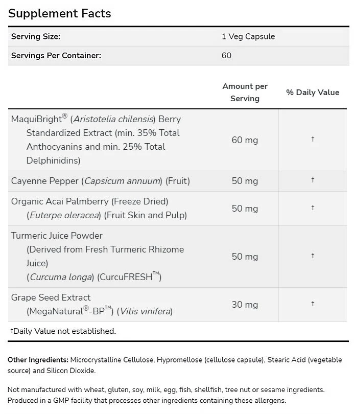 ingredients: Microcrystalline cellulose (filler), hydroxypropylmethylcellulose (glazing agent), Maqui fruit extract (Aristotelia chilensis) MaquiBright®, cayenne pepper powder (Capsicum annuum) (fruit powder), acai berry (euterpe oleracea) (freeze-dried skin and pulp), turmeric root powder (Curcuma longa), grape seed extract MegaNatural®-BP™ (Vitis vinifera), antioxidant [esters of fatty acids and ascorbic acid], anti-caking agent [silicon dioxide].