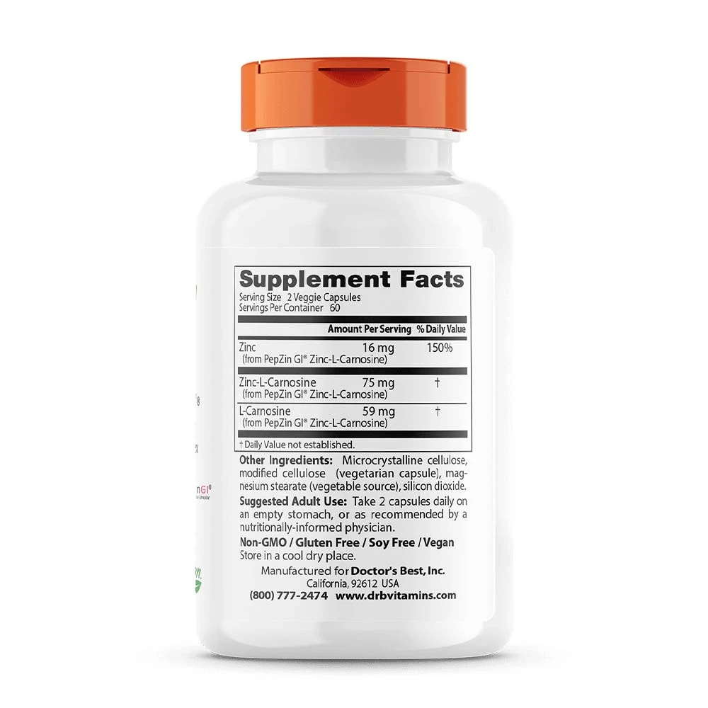 Ingredients: Zinc (from PepZin GI Zinc-L-Carnosine), Zinc-L-Carnosine (from PepZin GI Zinc-L-Carnosine), L-Carnosine (from PepZin GI Zinc-L-Carnosine), Microcrystalline cellulose, modified cellulose (vegetarian capsule), magnesium stearate (vegetable source), silicon dioxide.