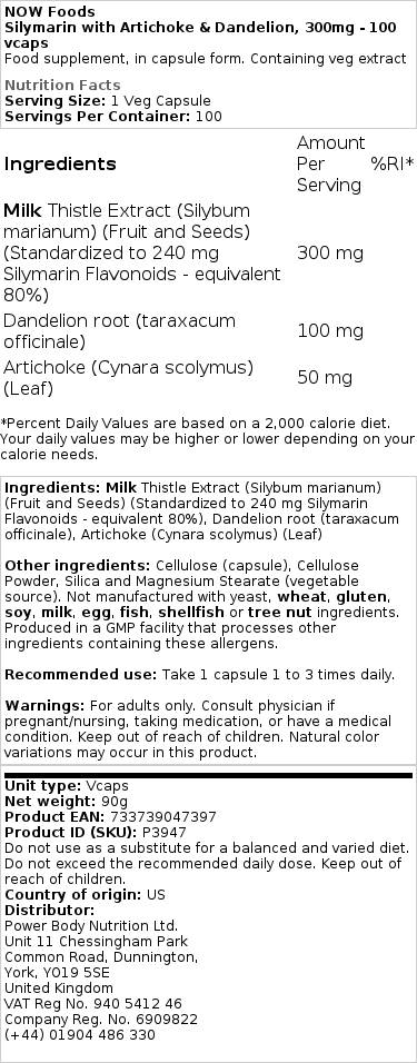 Opdag et naturligt valg med NOW Foods’ Milk Thistle Extract with Artichoke & Dandelion. Denne pakke indeholder 100 vegetabilske kapsler, hver fyldt med 300 mg ekstrakt.Produktet er fremstillet i USA og lægger vægt på høj kvalitet og naturlige ingredienser.