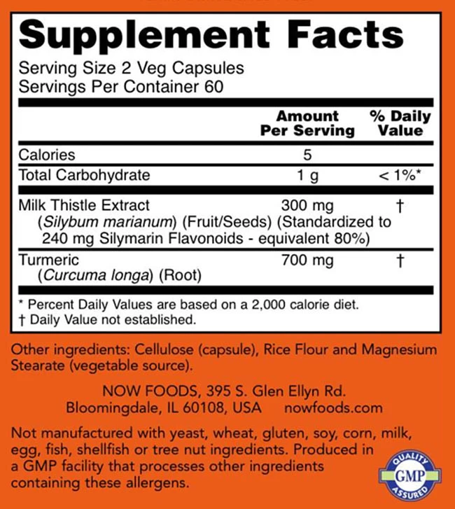 This product features milk thistle extract standardized to silymarin flavonoids and turmeric root,encapsulated in a cellulose-based capsule. Manufactured by NOW Foods in the United States of America.