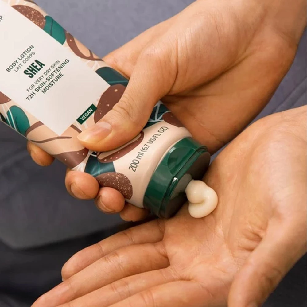 The Body Shop Shea Vegan Body Lotion is available in a 200 ml pack size. This product is from The Body Shop and features shea butter as a key component.