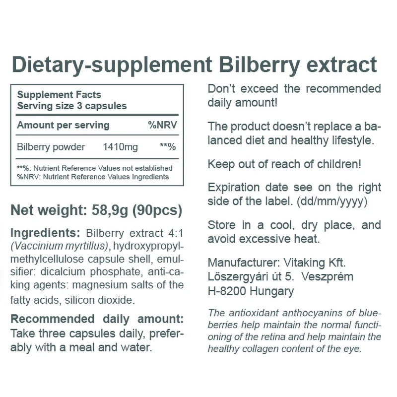 Discover Vitaking Blåbær Ekstrakt 470 mg,available in a convenient pack of 90 capsules. This food supplement is produced by Vitaking and contains bilberry extract.