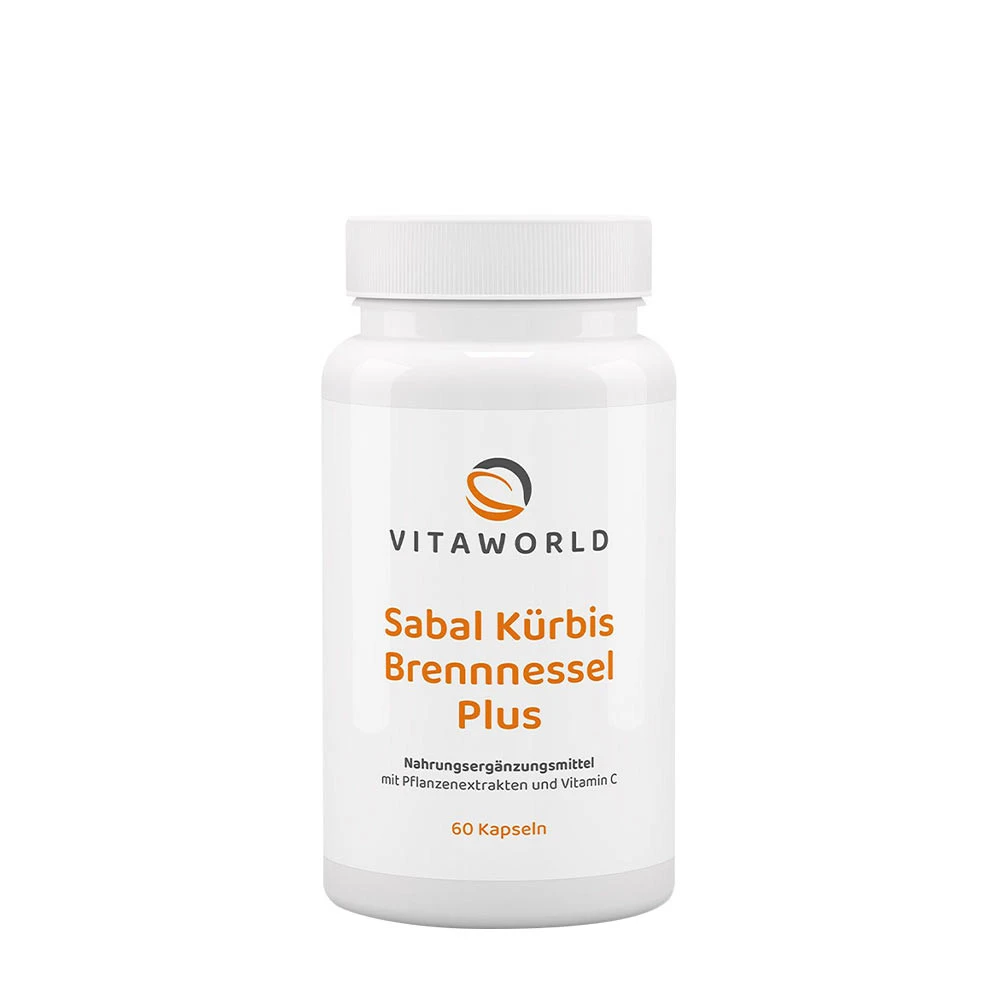 Vitaworld Sabal græskar Nælde Plus contains a blend of ingredients including sabal (saw palmetto), pumpkin, and nettle. Each pack contains 60 easy-to-take capsules.